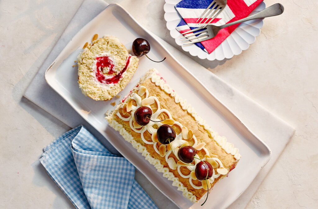 This cake is two bakes for the price of one – what more could you want? Creamy, jammy Swiss roll is topped with flaked almonds and cherries for a Bakewell finish. Slice it up and dig in!