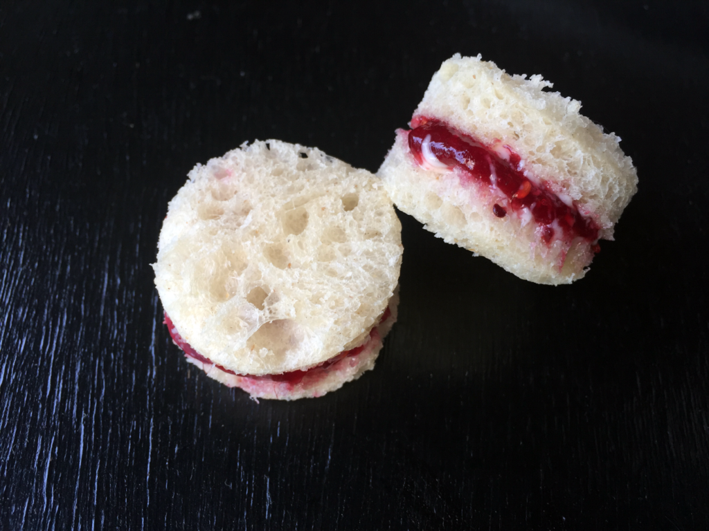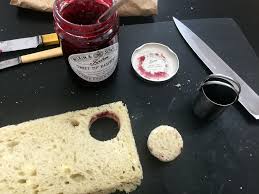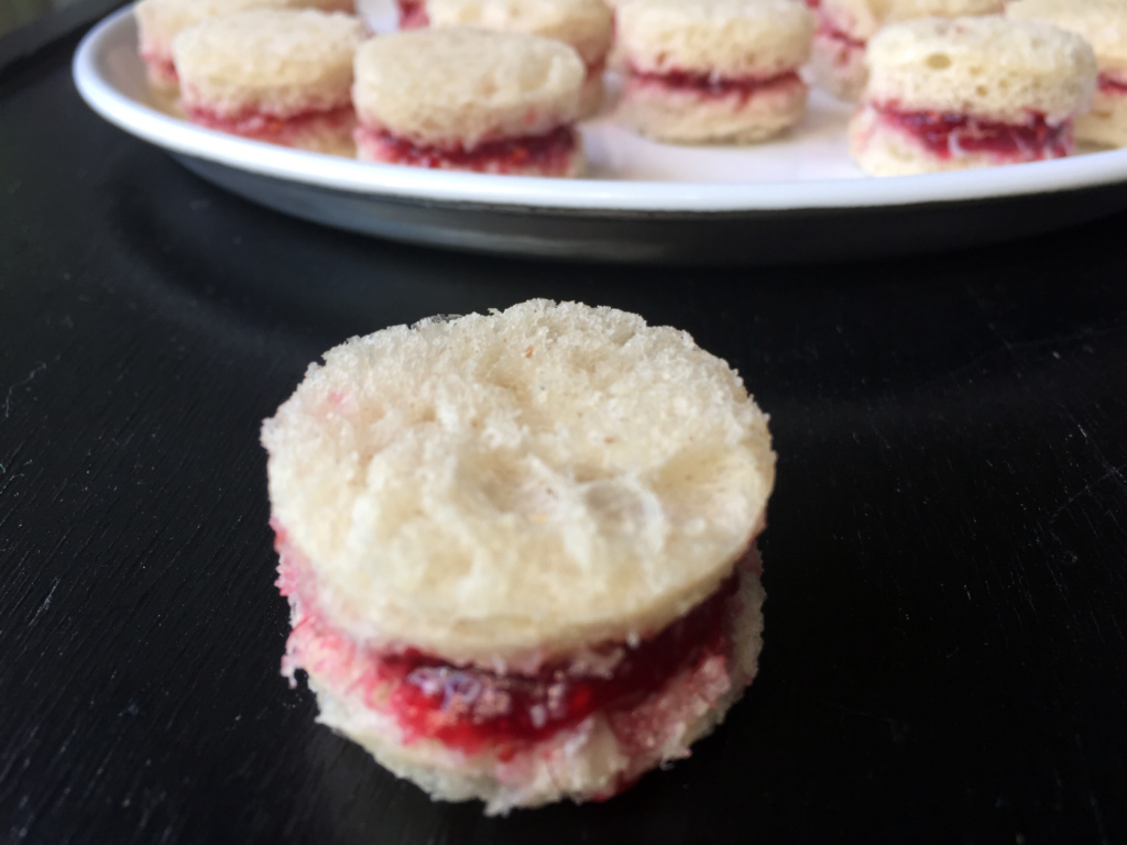 Jam Pennies are said to be a favourite of the Queen. They are a beautiful sandwich buttered, filled with raspberry jam and cut into little circles the size of an old English penny…..hence the name, Jam Pennies.